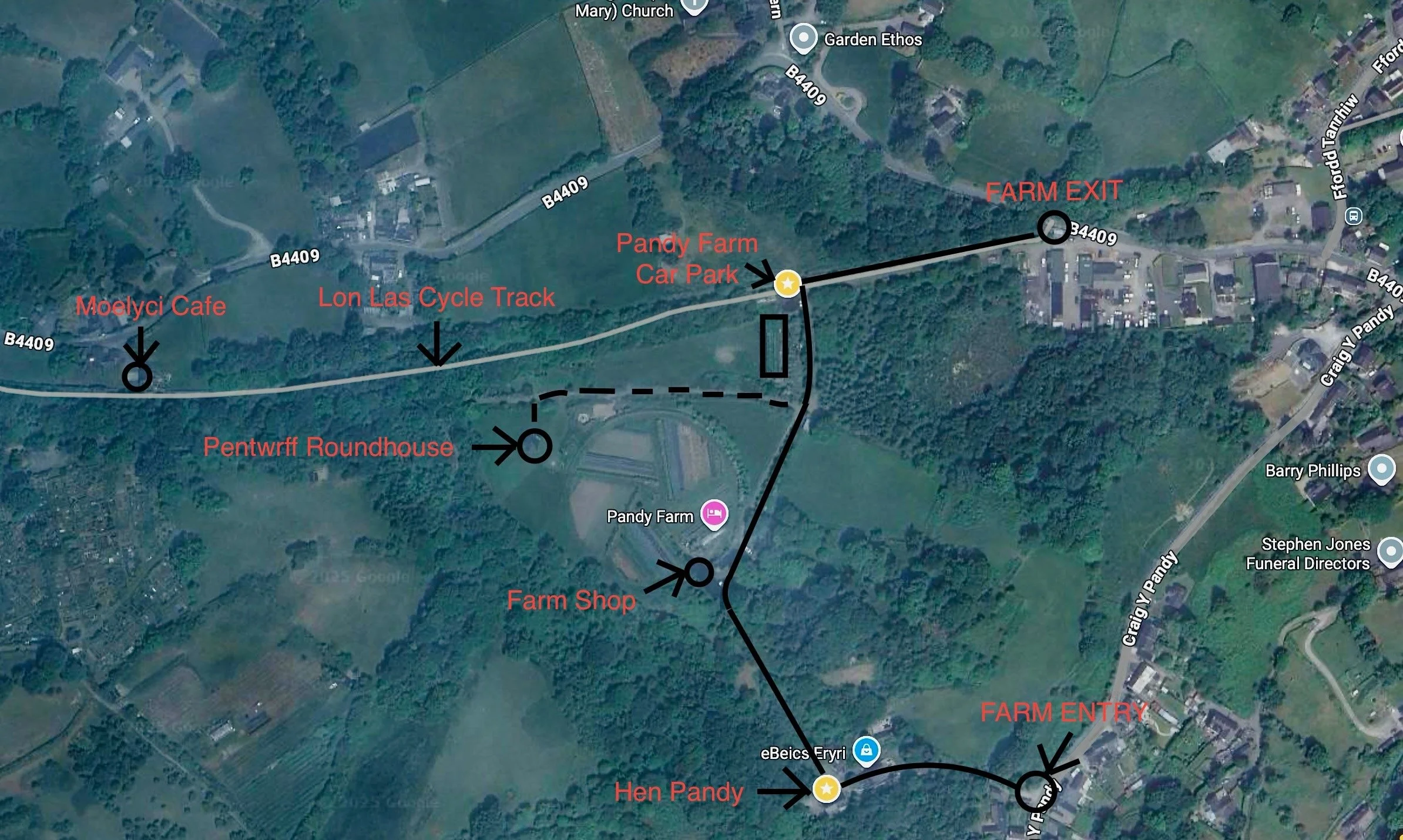 Enter the farm from the lane adjacent Pandy Motors garage and follow the lane to the farmyard.